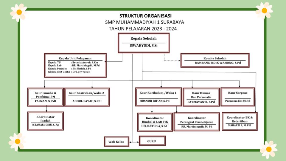 Struktur organisasi SMP Muhammadiyah 1 Surabaya adalah kerangka atau tata letak yang mengatur bagaimana sekolah diorganisasi dan dijalankan. Struktur organisasi ini mencakup berbagai elemen dan komponen yang membentuk hierarki administratif, serta cara berinteraksi dan mengambil keputusan di dalam SMP Muhammadiyah 1 Surabaya. Di bawah ini adalah komponen utama dari struktur organisasi sekolah yang umum: