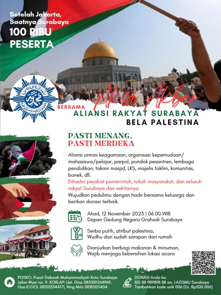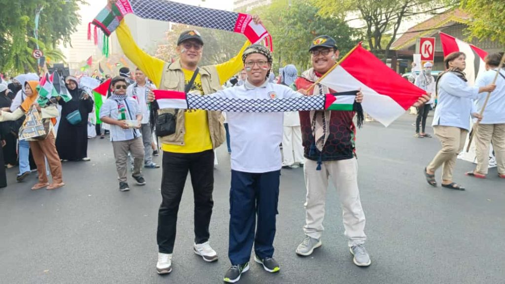 Pantauan di lokasi mencatat bahwa ribuan peserta aksi solidaritas dengan Palestina telah membanjiri Jalan Gubernur Suryo sejak pukul 05.30 WIB. Mereka bergerak bersama-sama menuju Gedung Negara Grahadi Surabaya dengan mengenakan pakaian serba putih dan melengkapi diri dengan simbol-simbol Negara Palestina. Sebagian dari mereka juga membawa poster dan kardus yang mengekspresikan dukungan terhadap kemerdekaan bangsa Palestina serta kecaman terhadap agresi militer Zionis Israel. Aksi ini juga mencakup orasi yang disampaikan oleh perwakilan dari berbagai organisasi masyarakat secara bergantian. Selain itu, acara ini diisi dengan doa bersama dan penggalangan dana yang dilakukan dengan berkeliling.